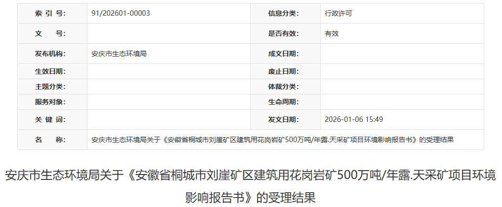 近日,安徽安庆市生态环境局发布关于《安徽省桐城市刘崖矿区建筑用花岗岩矿500万吨/年露.天采矿项目环境影响报告书》的受理结果。