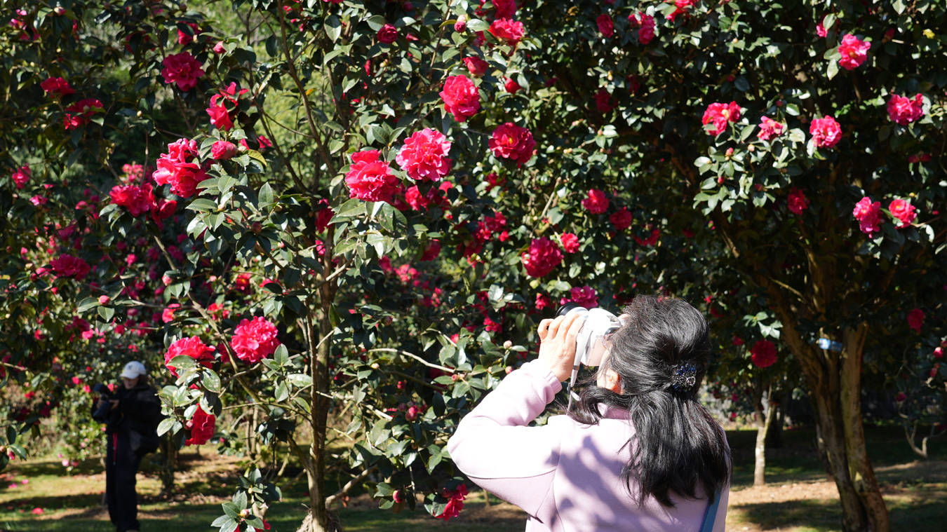 连日来,园内130多个品种、4000余株茶花陆续吐蕊,构成一幅绚烂的春日画卷。