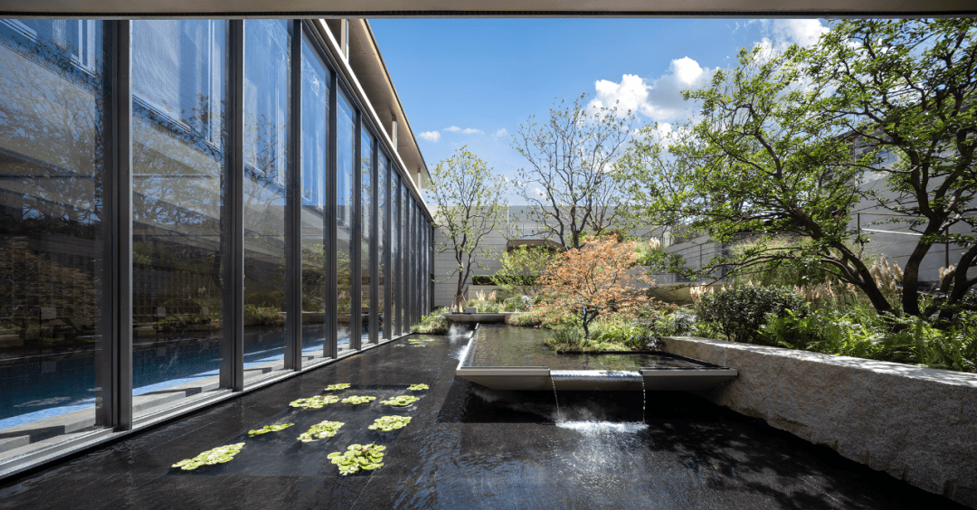 其中“点睛之笔”落在云崖悬厅,是以世界知名建筑“流水别墅”的美学为设计内核,8级落瀑从高处倾泻而下,水声潺潺间与下沉式景观相融。