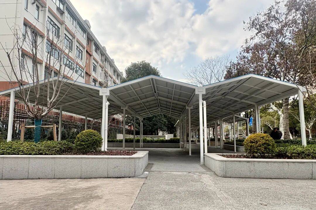 上海市北郊学校门口的绿地改造,精准回应了家长和居民的需求痛点。原本局促的接送区如今宽敞明亮,整排钢结构雨棚取代了零散帆布棚,不仅更加美观坚固,还加装了照明设施,为傍晚接送孩子的家长照亮等候之路。